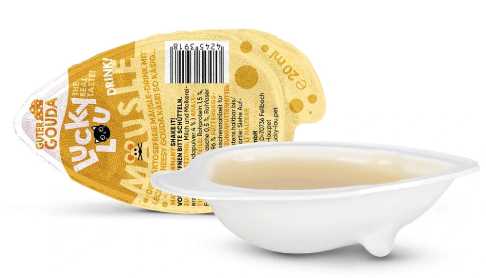 Lucky Lou Mäusle Drink je vhodný pro kočky všech velikostí a věkových kategorií. Je k dostání ve dvou příchutích – gouda a čedar. Zavřený pamlsek v neporušeném obalu skladujte při běžné pokojové teplotě. Po otevření uchovávejte v lednici. Před použitím protřepejte.