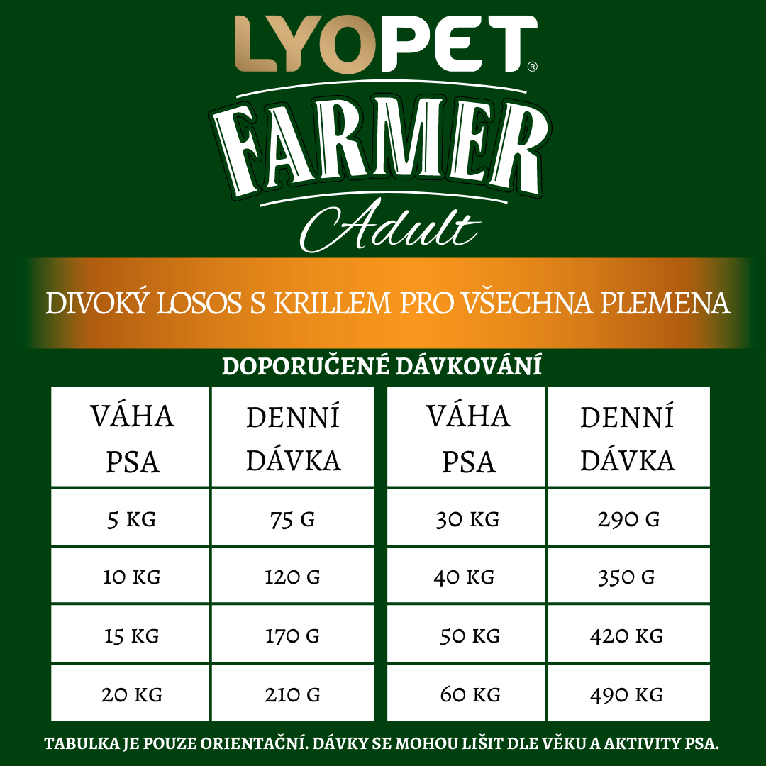 Lyopet Farmer je kompletní superprémiové krmivo pro psy všech plemen. Obsahuje rybí granule, šetrně zpracované za nízkých teplot, obalené v mase sušeném mrazem a v arktickém krillu. Kvalitní granule pro psy s vysokým obsahem masa, bez chemie a konzervantů.