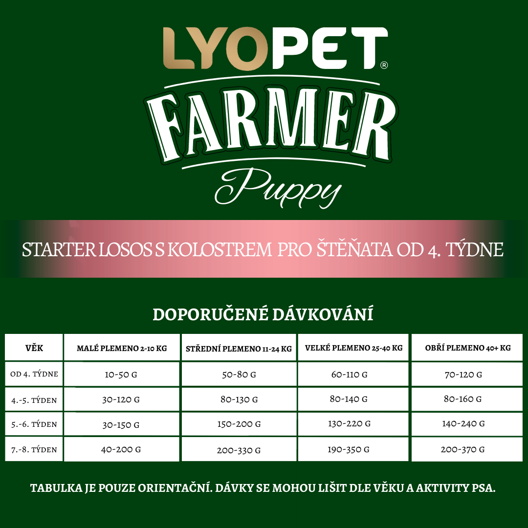 Lyopet Farmer je kompletní superprémiové krmivo, speciálně navržené pro štěňata od 4 týdnů. Obsahuje lososové granule, šetrně zpracované za nízkých teplot, obalené v mase sušeném mrazem a v BIO kolostru. Nejlepší granule pro štěňata s vysokým obsahem masa, bez chemie a konzervantů.
