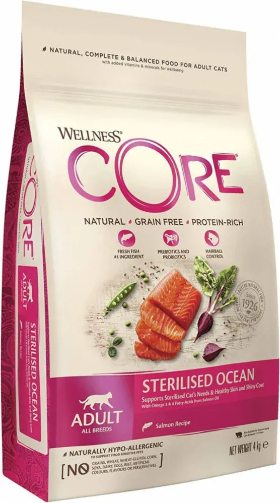 Zdravou pokožku, lesklou srst a optimální váhu zajistíte vaší kočce superprémiovým krmivem Wellness CORE Sterilized Ocean, které je zdrojem omega 3 a 6 mastných kyselin z lososového oleje. Krmivo, které bylo navrženo speciálně pro sterilizované kočky, udrží kočku zdravou a v optimální váze. Obsahuje pouze vysoce kvalitní bílkovinné přísady. Základem krmiva je čerstvé maso z lososa. Receptura bez drůbeže je ideální pro kočky, které potřebují jiný zdroj bílkovin (pro citlivé kočky, které nemohou jíst drůbeží proteiny). Se sníženým obsahem kalorií odpovídá sníženým potřebám méně aktivních nebo sterilizovaných koček. Zároveň je vhodná také pro starší kočky mezi 7-11 lety. Jedná se o přírodní, kompletní a vyváženou recepturu spolu s jedinečnou směsí zdravých zelenin, superpotravin a doplňků výživy. Díky vysokému množství vlákniny, podporuje snižování tvorby trichobezoárů.
